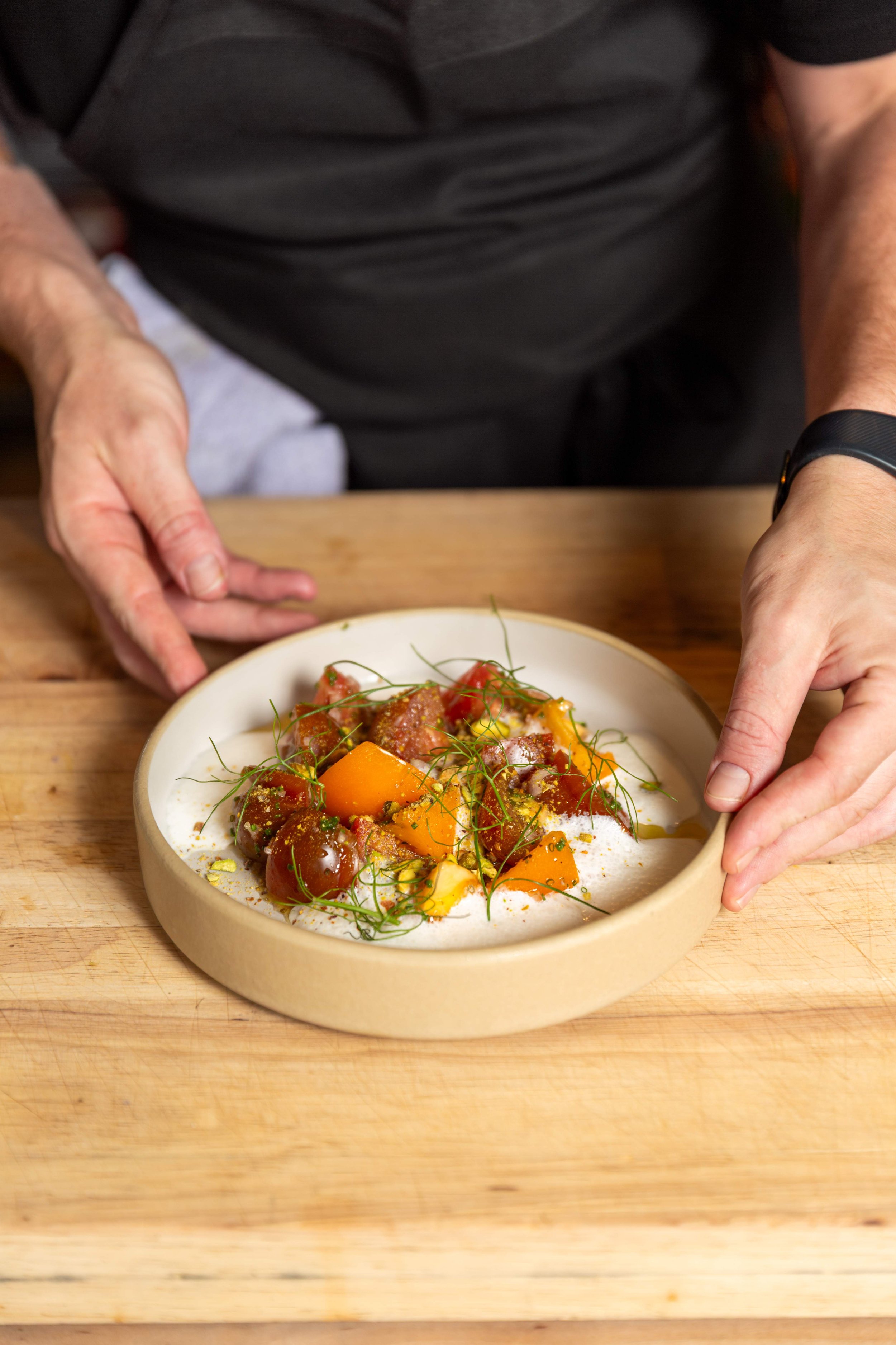 Spoon some of the vinaigrette over the tomatoes to dress. Garnish with flake salt, crushed pistachio, herbs, and grated parmesan.